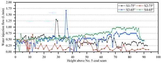 It can be seen from Figure 19 that borehole S2 with an elevation angle of 75° has a small flow change within the first 90 m, indicating that it may not pass through the WFFZ due to inappropriate elevation or drilling errors. Within the range of 70 m to 85 m above the working face, the flows in boreholes S3 and S4 both increased significantly, returning average flows of 0.73 L/min and 0.95 L/min, respectively; the water flow in boreholes S3 and S4 decreased rapidly from 85 m and 87 m, respectively. Between 70 m and 90 m above the working surface, the flow in the control hole S1 was between 0.25 L/min and 0.4 L/min, so the maximum development height of the WFFZ is 87 m; however, considering that the observation borehole is long, there will be some offset in the drilling direction, and the borehole end is located near the middle of the working face, rather than the highest position of the WFFZ near the boundary of the working face. So, the actual maximum height of the water-conducting fracture zone may be greater than 90 m. In summary, the field measured height of the WFFZ is closer to the 83 m obtained by physical similar simulation, but it is quite different from the empirical formula, which proves that the empirical formula is not accurate when used to predict the WFFZ in SHCSHRFB.