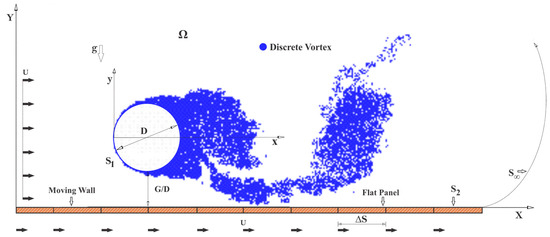 In heat transfer, the term advection is used to represent the macroscopic motion of a fluid mass. As an analogy, each vortex blob is now advected with its own velocity, which is induced on the fluid, characterizing, thus, a purely Lagrangian description. Furthermore, for the solution of the advective part of the vorticity transport equation (Equation (4)), it is necessary to calculate the velocity field. The contributions to the total velocity of a vortex blob, , are due to the undisturbed incident flow, the solid boundaries (source panels representing both the cylinder and ground plane surfaces), and the viscous wake. To compute the vortex–vortex interaction, the velocity at any point of interest in the two-dimensional fluid domain is obtained by summing over all vortex blobs and inserting the discretized vorticity in the expression representing the Biot–Savart law.