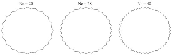 The rough geometry is constructed by creating a polygon with flat panels (equivalent to an auxiliary cylinder) and each panel of this polygon becomes the base of an isosceles triangular element of height . Thus, discretizing panels structure the final geometry, as shown in Figure 2.