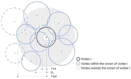 In Eulerian approaches, the simplest way to estimate the spatial average is with respect to the six points to the position point x [57] for three-dimensional simulations and the four points in two-dimensional simulations. For the present Lagrangian approach, there is a convenient technique proposed by Alcântara Pereira et al. [11]: the vortex blobs, with velocities that are considered in the Second-Order Velocity Structure Function, must be properly located in a circular crown bounded by and , which are, respectively, the inner and outer radii around the vortex with core size and turbulent activity to be defined, as shown in Figure 3. The insertion of the inner radius is to eliminate the singularity in the velocity equation (Equation (8)). The turbulent viscosity is then defined locally and dynamically during the simulation.