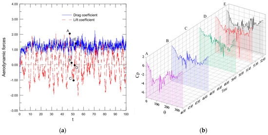 The points indicated in Figure 4a correspond to times A (t = 46.95), B (t = 48.70), C (t = 50.60), D (t = 51.75), and E (t = 52.50), and the respective instantaneous distributions of the circumferential pressure coefficient are shown in Figure 4b. Point A indicates that a clockwise vortical structure is shedding at the top of the cylinder, where a maximum positive lift force and a drag force that is still increasing acts (Figure 4b). The drag force will increase until the moment when the clockwise vortical structure starts to be incorporated by the wake (point B). Point B indicates the imminence of an inversion in the lift coefficient, as can be seen in Figure 4a. This inversion means that the clockwise vortical structure, shedding from the cylinder surface at point A, begins to be incorporated by the wake formed downstream of the body. In Figure 4b, a zone of low pressure is recognized to be approximately constant between and .