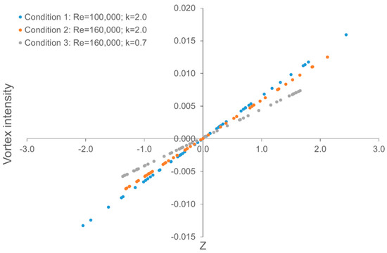 Figure 5 shows the instantaneous distribution of the intensity of the nascent vortices at time as a function of the , considering the cylinder with a moderately rough surface and different vorticity discretization conditions. The DVM without changing the cutoff width is represented by the distribution in condition 1, and , which results in . In the sequence, we have a distribution with modest reductions in the dispersion and magnitude of the vortex intensities, keeping for a higher Reynolds number, , in condition 2. The resulting drag coefficient is 0.88. However, if the Reynolds number, , which is the critical Reynolds number for relative roughness , is maintained, and the cutoff width is reduced to , the corresponding is satisfactorily predicted. Under this third condition, both the magnitudes and the dispersion of vortex intensities are drastically reduced in absolute terms.