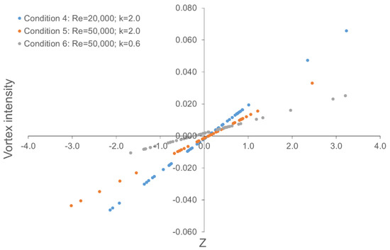 Now if a high roughness is considered, , for example, the result summarized in Figure 6 is observed. Conditions 4, 5, and 6 are, respectively: and ; and ; and and . For these new conditions, the assumes values of 1.27, 1.14, and 0.78, respectively. It can be observed that the reduction in the dispersion of the vortex intensity value is more sensitive to the reduction in the cutoff width () than to the simple increase in the Reynolds number from to . The critical Reynolds number for relative roughness is around , and the corresponding drag coefficient, . These results confirm the findings of Oliveira and Alcântara Pereira [15]; in two-dimensional DVM the adequate prediction of aerodynamic forces depends jointly on the relative roughness, , the Reynolds number, Re, and the cutoff width, k, assumed for vorticity discretization.