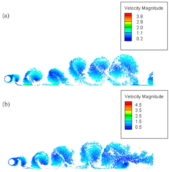 The velocity field resulting from the hybrid control of the shedding of vortical structures from the cylinder is shown in Figure 7 for a Reynolds number equal to and . As an example, the relative roughness ratios and are considered, whose corresponding k are predicted to be 2.0 and 1.7, respectively. In the first case, the results are , , and , and in the second case, , , and .