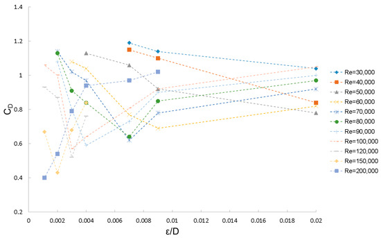 Rough cylinder surfaces influencing the Strouhal number were experimentally investigated by Achenbach and Heinecke [32] for Reynolds numbers varying between and . A rapid increase in the Strouhal number was observed in critical flow conditions. For increasing the values of roughness, this increase in the Strouhal number became smaller and smaller. According to Sumer and Fredsøe [1], for cylinders with a relative roughness greater than , the critical, supercritical, and upper transition flow regimes merge in a narrow region and change directly to the transcritical regime. This occurs at low Reynolds numbers. Achenbach and Heinecke [32] also presented experimental results for the behavior of the drag coefficient as a function of the Reynolds number () and identified that for a relative roughness , the tended to converge to a value around 1.2 for the lower interval of the subcritical regime—this study had a limiting roughness of .