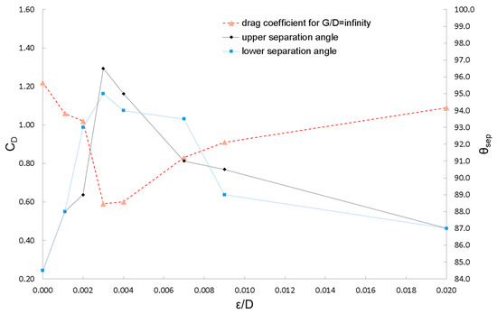 A closer inspection of Table 1 reveals that the lift coefficient assumes values around zero for rough cylinder isolated from the moving wall due to the symmetry of the flow. The Strouhal number tended to be insensitive to increasing roughness (), excluding the and roughness values. Relatively high Strouhal numbers, and , respectively, are convergent with the larger separation angles, as shown in Figure 9. Figure 9 makes it explicit that the reduction in the drag coefficient, which is inversely corresponding to the increasing trend of the Strouhal number, is a consequence of the approximation of the two shear layers of opposite signs formed by the separation of the boundary layer in the cylinder, moving the separation angles downstream.