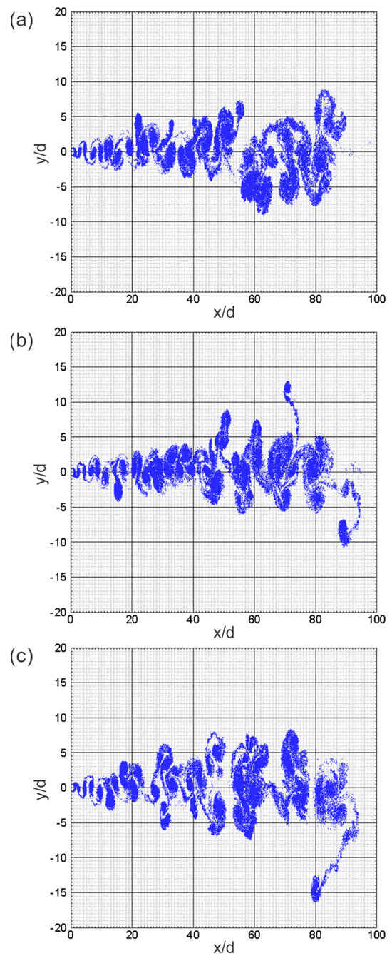 Complete configuration of the wake formed downstream of the isolated cylinder with different rough surfaces—: (a) , (b) , and (c) .