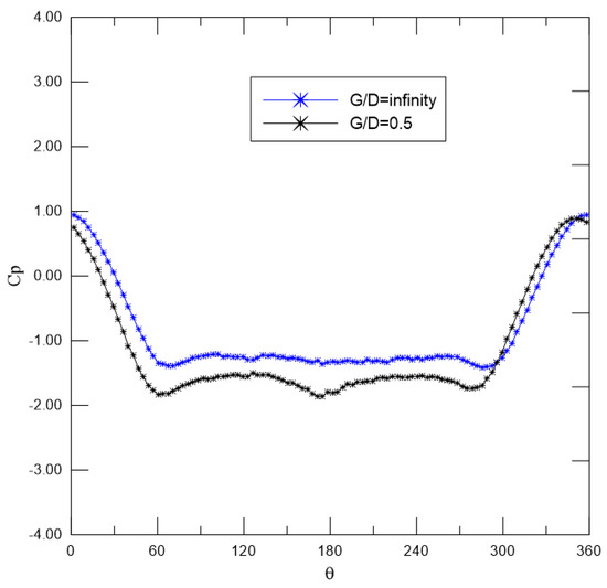 The intrinsic characteristics of the turbulent flow around the cylinder away from the moving wall can be explained physically by interpreting the instantaneous distribution curve of the pressure coefficient on the discretized surface of the body using Gerrard’s interpretation [6], which conjectures that a growing vortex gaining circulation from the shear layer, which forms from the boundary layer separation on one side of the cylinder, becomes intense enough to attract the opposite shear layer through velocity induction. Conversely, the approaching flow with opposing vorticity, with a certain intensity, ceases the circulation supply of the growing vortex, and thus, it is disconnected from the shear layer and subsequently thrown downstream of the body, incorporating into the viscous wake.