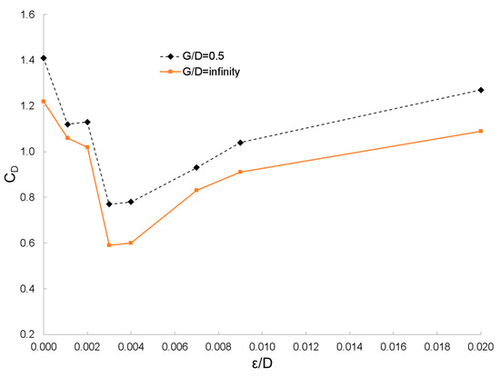 In fixing the Reynolds number, i.e., , the drag force of rough cylinders in the vicinity of the wall under the condition of the large-gap regime, , was relatively greater than those of isolated rough cylinders, G/D→∞, due to the action of the Venturi effect. The generation of large-scale vortices downstream of the cylinder attracts fluid from the base region of the cylinder, culminating in a higher drag coefficient. Nishino [13] reported similar result for a smooth cylinder. In the scenarios evaluated in this study, cylinder roughness always acted to reduce drag force compared to the smooth surface (Table 1) and was dominant in the transition from a large-gap to intermediate-gap regime. There was also a significant reduction in the drag coefficient induced by the roughness values and in the presence of the Venturi effect, which were equivalent to 45.4% and 44.7%, respectively. In general, the Strouhal number tended to be insensitive to the approach of the cylinder to the moving wall in the same flow configuration as in the isolation condition.