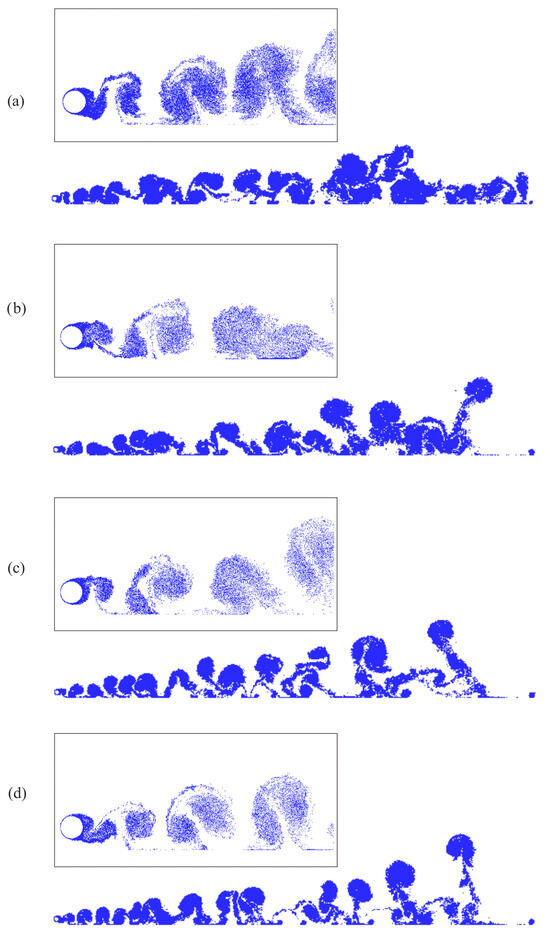 Configuration of the near and full wake formed downstream of the cylinder with different rough surfaces close to the moving wall— and : (a) ; (b) ; (c) ; and (d) .