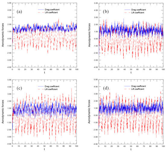 Time series of drag and lift coefficients for cylinder under the effect of the moving wall—, , and : (a) ; (b) ; (c) ; and (d) .