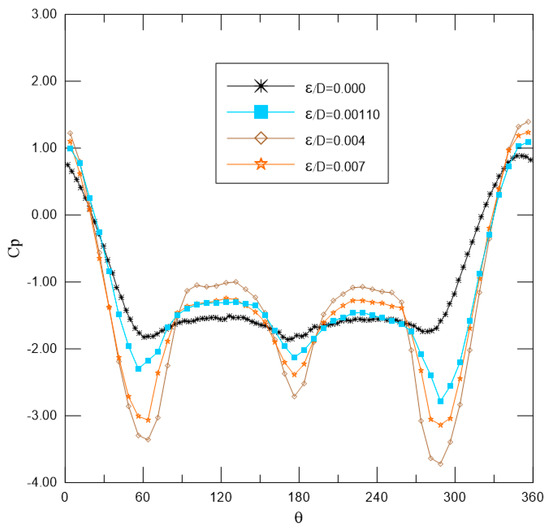 The control of the wake, or in the extreme case of proximity to the horizontal wall, the suppression of the shedding of vortical structures, is linked to the asymmetry in the development of the vortical structures on the two sides of the cylinder: the vortical structure on the free flow side grows larger and stronger than the vortical structure on the wall side. Thus, the interaction of the two vortical structures is largely inhibited [1,11]. Plotted in Figure 15 are the circumferential pressure coefficients for these different surfaces of the cylinder in interacting with the moving wall. Depending on the roughness height distributed over the body, there is a greater or lesser suction peak on both sides of the cylinder (top and bottom) and a corresponding change in the base pressure. The intensification of the suction peak on both sides of the cylinder tends to be symmetrical for smooth surfaces and is clearly asymmetrical for rough surfaces. This can be understood as a result suggesting that the cylinder roughness height acts to anticipate the characteristics of a lower gap ratio regime.
