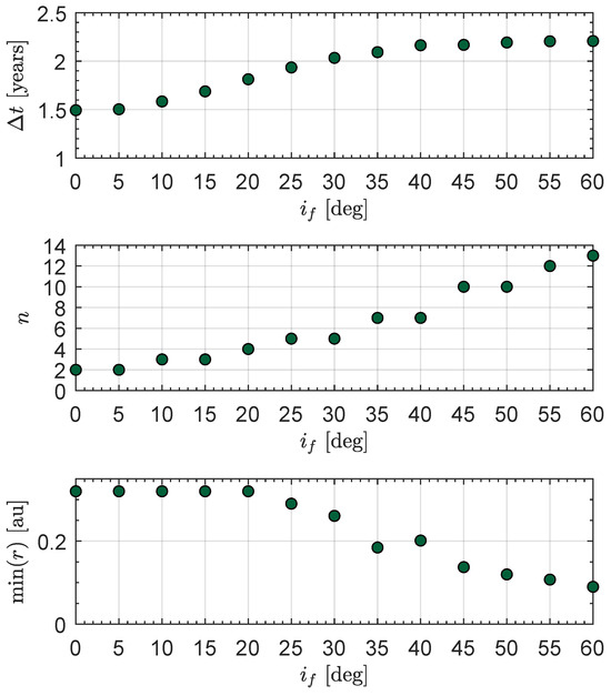 The results can be seen in Figure 2, where the optimal transfer times , the total number of revolutions around the Sun n, and the minimum distance from the Sun reached during the transfer are illustrated. The figure shows that up to an inclination of about , the trajectory tends to the target orbit without the minimum distance dropping below , while for larger inclinations, the minimum-time trajectory would tend to approach the Sun up to distances less than and then rise to the final desired value. Assuming that the minimum distance from the Sun compatible with the maximum thermal load supportable by the sail is , which corresponds to the perihelion distance of Mercury from the Sun, it is clear that unconstrained transfers with inclinations greater than about are not feasible.