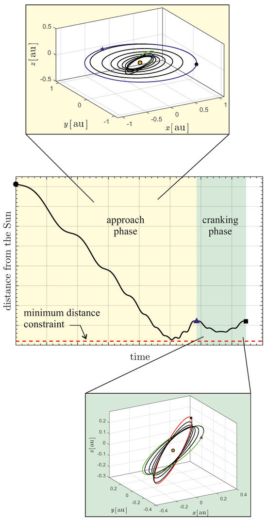 Since the computation of minimum-time trajectories with a constraint on the minimum distance from the Sun usually presents considerable numerical convergence difficulties [27], it was decided to study near-optimal trajectories, using a two-step strategy. In more detail, having fixed the value of , with the help of the results in Figure 2 it is possible to determine the maximum inclination, denoted by , achievable with an unconstrained optimal transfer such that the satellite is taken to the final distance without violating the constraint on . Clearly, it follows from the definition that . The near-optimal trajectory consists of a first phase (referred to as approach phase) in which the spacecraft reaches a circular orbit with radius and inclination using a minimum-time trajectory. The second phase consists of an optimal cranking trajectory, i.e., a minimum-time trajectory in which the initial and final distances coincide and the orbital plane is rotated until the final orbital inclination is obtained. At the end of the second phase, the spacecraft has thus reached the circular orbit of radius and inclination . The strategy adopted is qualitatively illustrated in Figure 3 in which the blue triangle represents the instant at which the first phase ends and the second begins.