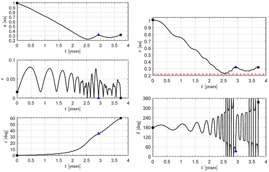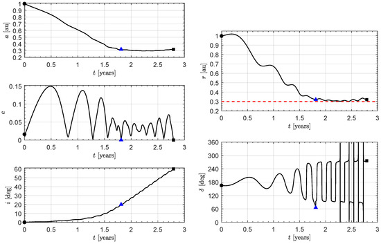 Time variation of orbital parameters and control variable in a near-optimal transfer to a circular heliocentric orbit of radius and inclination using the two-phase strategy (). Black circle → start; black square → arrival; blue triangle → first phase end; dashed red line → minimum solar distance.