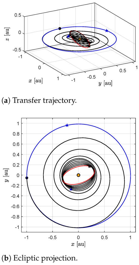 Near-optimal trajectory to a circular heliocentric orbit of radius and inclination using the two-phase strategy (). Black circle → start; black square → arrival; blue triangle → first phase end; blue star → perihelion; orange circle → the Sun; blue line → parking orbit; red line → target orbit; black line → transfer trajectory.