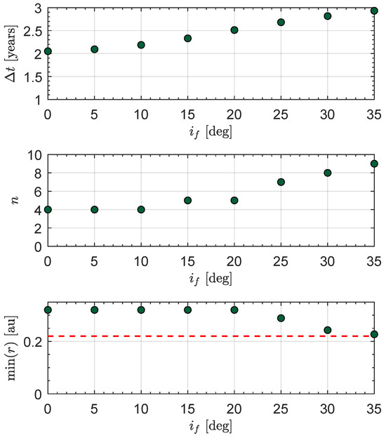 As mentioned in the previous section, it is not possible to determine a priori whether or not the minimum-time trajectory requires a close pass to the Sun in order to reduce the time necessary to increase the orbital inclination and reach the plane of the target orbit. To better analyze this problem, unconstrained optimal transfers to the target orbit were preliminarily calculated, without taking into account the minimum distance from the Sun reached during the transfer. These transfers were obtained by imposing to reach in the minimum time a circular orbit of a radius equal to that of the target orbit (i.e., ), but varying the final orbit inclination in the interval with a step of . Simulations were carried out using a characteristic acceleration , which is compatible with the performance of the reflective sail used for the Solar Polar Imager mission study [29].