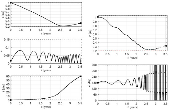 Time variation of orbital parameters and control variable in an optimal transfer to a circular heliocentric orbit of radius and inclination (). Black circle → start; black square → arrival; dashed red line → minimum solar distance.
