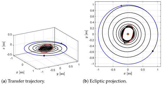 During the first phase, the distance from the Sun decreases until it reaches the minimum distance constraint after about , and then rises again to the distance of . During the second cranking phase, the spacecraft tends to slightly decrease its distance from the Sun, without approaching the minimum value, while the orbital inclination increases monotonically with small oscillations. The transfer trajectory found is shown in Figure 8. The duration of the first phase is , and that of the second phase is for a total of . These results are close to those reported by Chu et al. [30], who found a total time of for the same transfer, albeit using a more complex locally optimal control law than the one proposed in this paper. To further quantify the performance of the two-phase strategy, an optimal transfer was calculated using an indirect method [19] with the intermediate constraint of . The results of the simulations are shown in Figure 9, while the minimum-time trajectory is reported in Figure 10.