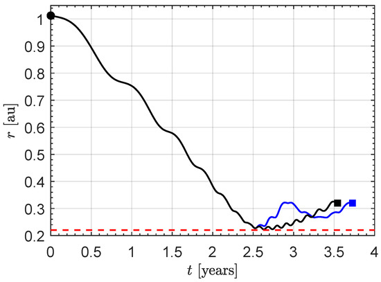 Comparison of the two-phase strategy (blue line) and the optimal control law (black line) with . Dashed red line → minimum solar distance; filled circle → start; filled square → arrival.
