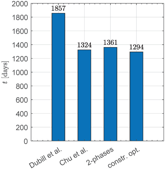 The total transfer time in the optimal case is , so that the two-phase strategy effectively determines a near-optimal solution, with a difference of (equivalent to an error of only ) compared to the optimal solution. Figure 12 shows a simple comparison of the various solutions available in the literature, in terms of flight times, including the simple non-optimal solution proposed by Dubill and Swartzlander [21].