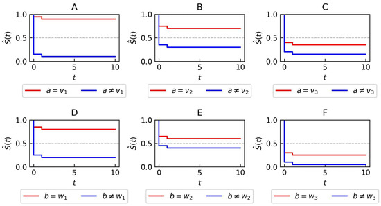 Synthetic data—Kaplan–Meier plots for two attributes a and b used in the illustrative example of rule generation. Each subfigure presents two distinct curves. The red curve corresponds to data points that have either attribute a (A–C) or b (D–F) set to a particular value. The blue curve represents all other data points that don’t fit the criteria specified for the red curve (A–F).