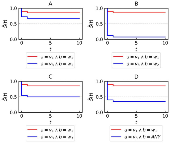 Figure 4. Syntheticdata—Kaplan–Meier plots for two attributes a and b used in the illustrative example of rule generation. Each subfigure presents two distinct curves. The red curve corresponds to data points that have attribute a set to the value and b set to value (A–D). The blue curve corresponds to data points that have attribute a set to the value and b set to value (A), (B), (C) or (D) value. - An action is created from the condition and counter-condition (line 10 in Algorithm 2). This action is then added to the premise of the rule (line 11 in Algorithm 2).