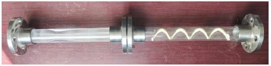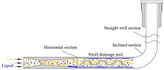 The outer diameter of the venturi accelerated vortex tool is consistent with that of the coiled tubing. The four-helix swirl structure was designed in the tool. It was attached to the bottom of the coiled tubing in the horizontal section. The flow pattern of the gas and liquid mixture flow can be transformed to swirl laminar flow with gas inside and liquid outside in the horizontal section, as shown in Figure 2. This achieved gas–liquid separation flow can induce the flow of the gas along the center of the horizontal tube, while the liquid flows spirally along the wall due to the impact of the centrifugal force. Simultaneously, the inlet velocity of the vortex tool is increased, the distance of the swirling flow is extended, and the drainage efficiency is enhanced by the design of the venturi acceleration structure.