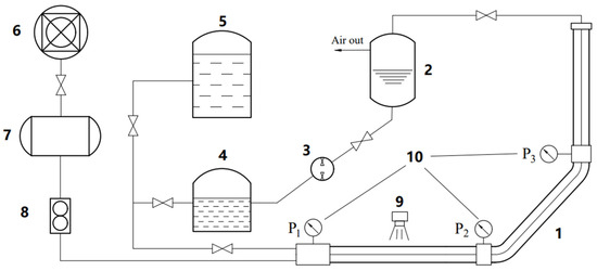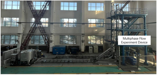 The multiphase flow experimental apparatus was designed and set up to conduct experiments on the swirl drainage of natural gas in horizontal wells. The apparatus primarily consists of a liquid inlet system, an air inlet system, a simulated test tube system, a gas–liquid separation measurement system, and a data acquisition control system, as depicted in Figure 3. The physical photograph of the multiphase flow experimental apparatus is shown in Figure 4. The automatic control system of the device was used to control the opening and closing of the electric valves in the tube, as well as regulate the gas–liquid flow rates. The high-precision pressure gauges and flow meters were also installed along the tube to collect the pressure and the flow rate. The data acquisition and storage system was set to record the data every 5 s.