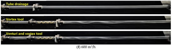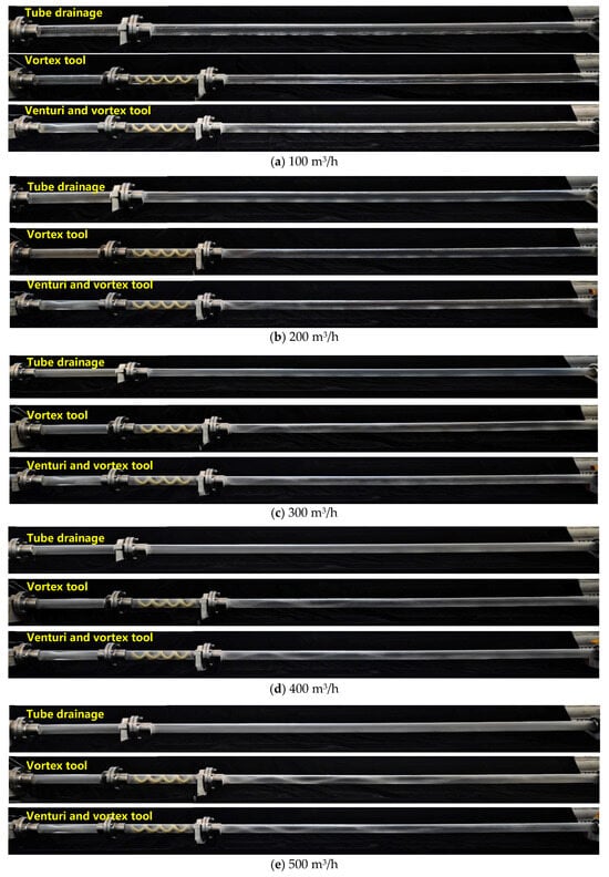 The drainage experiments of the horizontal tube were carried out using the three kinds of tube drainage, the vortex tool, and the venturi accelerated vortex tool. To compare the drainage performance of the different tool structures, a liquid flow rate of 3 L/min and a gas flow rate ranging from 100 m3/h to 600 m3/h were used, and the acquired results were thoroughly investigated. The flow pattern of the horizontal tube was photographed as the gas–liquid mixture flowed through the different tools. The captured spiral flow patterns are displayed in Figure 5.