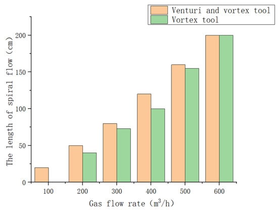 As shown in Figure 5, when the liquid flow rate is 3 L/min and the gas flow rate is 100 m3/h, the gas–liquid mixture flows in a typical layered flow pattern using the tube drainage. It is interesting to notice that no obvious sprial flow is formed using the vortex tool, and the short sprial flow is formed at the tool’s outlet using the venturi accelerated vortex tool. Additionally, the flow shows a trend of transitioning from layered flow to spiral flow downstream. When the gas flow rate is increased to 200 m3/h, spiral flow also occurs with the vortex tool. The spiral flow is clearer for the venturi accelerated vortex tool, and the length of spiral flow is slightly longer. However, after flowing a certain distance the flow essentially returns to laminar flow. As the gas flow rate continues to increase, the length of the spiral flow significantly increases. It can be clearly observed that the spiral flow produced by the venturi accelerated vortex tool is significantly longer than that of the other tool. When the gas flow rate reaches 600 m3/h, a stable spiral flow is formed. The spiral flow fills the horizontal observation tube (the length is 2 m) with the vortex and venturi accelerated vortex tool. Nevertheless, the flow is dispersed turbulent flow with the tube drainage. This effect indicates that the vortex tool can effectively separate gas and liquid, transforming the mixed gas–liquid turbulent flow into a laminar spiral flow. The measured length of the spiral flow is shown in Figure 6. As shown in this figure, the length of spiral flow formed by the venturi accelerated vortex tool is greater than that produced by the vortex tool alone. This is attributed to the presence of the constriction structure inside the venturi tube, which accelerates the fluid and promotes the formation of the spiral flow.