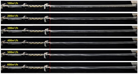 To further analyze the flow patterns of spiral flow for the venturi accelerated vortex tool, the spiral flow pattern with different gas flow rates was analyzed. The photographed flow fluid is shown in Figure 7 when the inlet liquid flow rate is 3 L/min and the gas flow rate varies from 100 m3/h to 600 m3/h. As the gas flow rate increases, the length of the spiral flow is also gradually increased, the pitch of the spiral flow is gradually reduced, and the spiral flow becomes more stable. When the gas flow rate reaches 500 m3/h, with the increase in gas flow rate, the length and pitch of spiral flow remain basically unchanged. The stable spiral flow is conducive to the carrying of liquid. According to the literature, due to the guidance of the spiral, the fluid obtains centrifugal acceleration, and the heavier liquid is thrown to the pipe wall, forming a rotary flow. As a result, the compressible gas is expanded, and the gas velocity at the center of the wellbore is increased [].