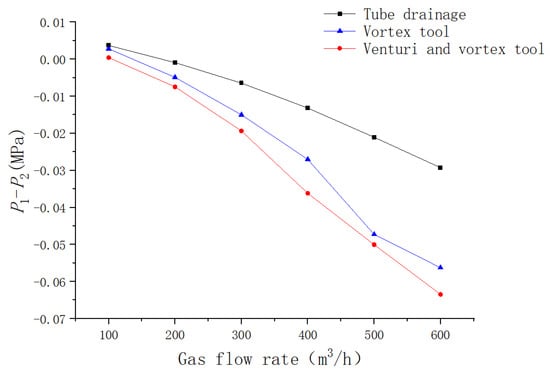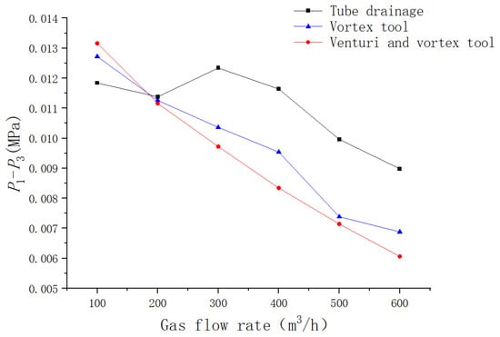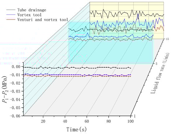 When the liquid flow rate is 3 L/min and the gas flow rate is 100–600 m3/h, the instantaneous pressure drop in the horizontal tube (P1–P2) was measured by conducting different experiments with the tube drainage, the vortex tool, and the venturi and vortex tool, as shown in Figure 8.
