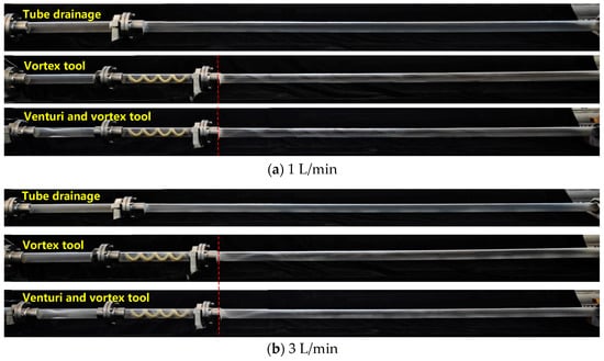 As shown in Figure 11, it can be observed that when the gas flow rate is 300 m3/h and the liquid flow rate varies from 1 L/min to 5 L/min, the fluid pattern changes from laminar flow to unstable annular flow for the tube drainage. Moreover, the fluid flows according to spiral laminar flow for the vortex tools. The venturi accelerated vortex tool can make this flow more stable than the vortex alone. When the liquid flow rate reaches 10–15 L/min, the kinetic energy of the gas flow is not enough to drive the liquid for the tube drainage. At this point, the vortex tool has a critical role. Although the stable flow characterized by the coupling of the spiral and turbulent flows was formed for the vortex tool, the liquid can be carried relatively well to flow out of the horizontal tube.