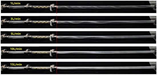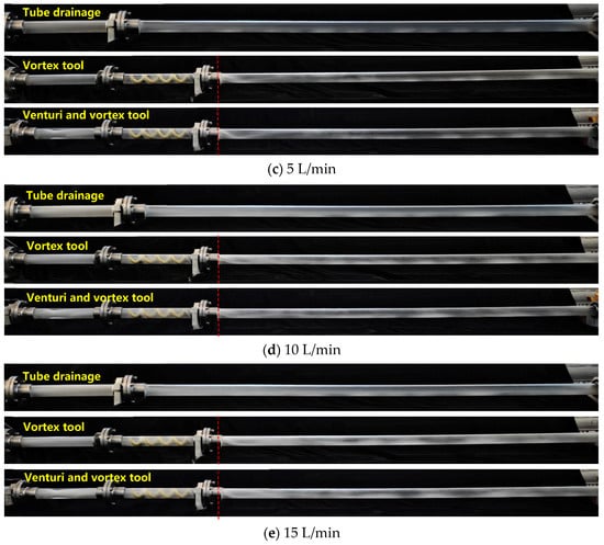 To further investigate the impact of different liquid flow rates on the drainage performance of the tools, liquid-carrying experiments with the gas flow rate of 300 m3/h and the liquid flow rates of 1, 3, 5, 10, and 15 L/min were conducted. Photographs of the spiral flow patterns in the horizontal tube with three tools are depicted in Figure 11.