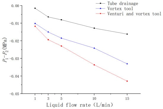 As shown in Figure 15, the average total pressure drop of the horizontal and vertical tubes gradually increases with the increase in liquid flow rate. This effect can be ascribed to the increase in the liquid flow rate that requires greater kinetic energy to carry the liquid out of the tube. Moreover, with the increase in the liquid flow rate, the average total pressure drop of the vortex tool is significantly lower than that of the tube drainage. The overall pressure drop for the venturi accelerated vortex tool is the smallest.