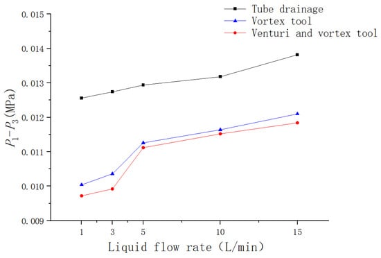 The average pressure drop in the horizontal tube (P1–P2) is shown in Figure 14 for the tube drainage, the vortex tool, and the venturi accelerated vortex tool when the liquid flow rate was 1–15 L/min and the gas flow rate was 300 m3/h. The average total pressure drop of these (P1–P3) is shown in Figure 15.