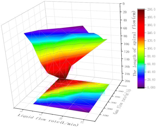 The length of spiral flow with liquid flow rate of 3 L/min and gas flow rates of 100 to 600 m3/h.