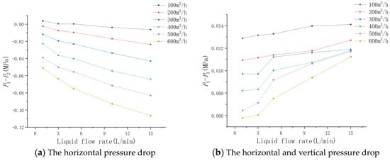 According to the above-mentioned analysis, the pressure drop in the horizontal tube was averaged, as shown in Figure 9, and the total pressure drop in the horizontal and vertical tube (P1–P3) was averaged, as shown in Figure 10.