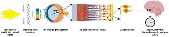 A circadian cycle is a series of processes occurring approximately every 24 h, which is derived from the Latin words “circa” and “diem” meaning about and day, respectively [2]. The circadian system is regulated by a central biological clock in the hypothalamic suprachiasmatic nucleus (SCN). Different physiological and behavioral processes are coordinated through it on a 24 h basis cycle [2,8]. Environmental cues, primarily light, stimulate the circadian clock. It is through the intrinsically photosensitive retinal ganglion cells (ipRGCs) located in the eye that light information is transmitted to the central clock in the SCN. These cells contribute specifically to the regulation of the circadian system as well as non-image-forming functions [9,10]. ipRGCs regulate circadian rhythms by releasing the photopigment called melanopsin [11,12]. Their photoreceptors are specifically sensitive to short-wavelength (blue) light, which makes them distinct from rods and cones that mediate visual perception [12,13]. ipRGCs are essential for synchronizing the circadian rhythm to the external cycles of day and night, which is vital for maintaining a healthy sleep–wake patterns and circadian balance [9,12,13] (Figure 1).