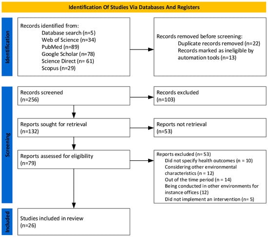 This review included only studies conducted in healthcare environments. English was the language of publication for all articles in the qualitative synthesis. The years of consideration were 2002–2023, and 2002 was chosen as a cutoff point since it was the year when ipRGC functionality was discovered [51]. Being out of time period, considering other environmental characteristics, or not specifying health outcomes led to 53 articles being excluded from the list of 79 eligible articles.