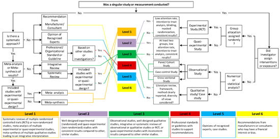 Research appraisal flowchart (level of evidence) following Stichler’s (2010) framework; adapted from [52,53,54].