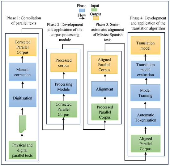 This paper introduces a methodology for the automatic translation of Mixtec–Spanish texts. The proposed approach is divided into four phases (shown in Figure 3), each addressing specific aspects of the translation process.