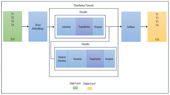 Vaswani et al. [11] proposed the transformer network, a new approach that includes attention mechanisms and positional encoding. The transformer network is based on an encoder–decoder architecture with attention mechanisms. Figure 2 illustrates the general architecture of a Transformer. The components of a Transformer network are detailed below.