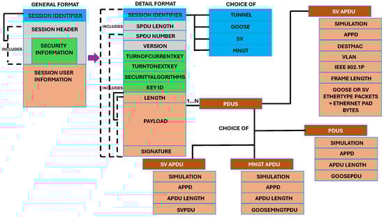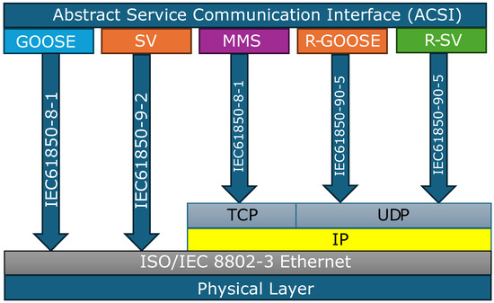 Within the electrical substations under the standard, the field level is distinguished, where the voltage and current transformers, disconnectors, switches, and merging units that digitize the voltage and current values of the transformers are located. The bay level, where the IEDs are located, applies control and protection over the field-level equipment and sends reports to the next higher level, the station level. There are three distinct types of messaging or information exchange, including GOOSE, SV, and MMS. The other two, R-GOOSE and R-SV, are used when this messaging must be sent to other networks [10,11]. The protocol stack of IEC61850, shown in Figure 1, contains the different types of messages mapped to different layers of the OSI model.