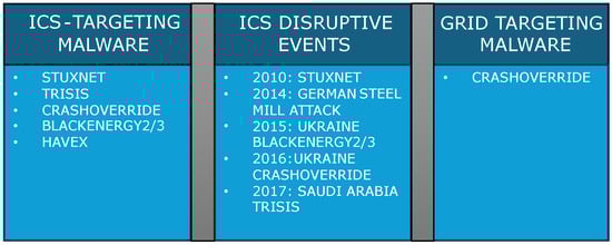 - Geiger, M.; Bauer, J.; Masuch, M.; Franke, J. An Analysis of Black Energy 3, Crashoverride, and Trisis, Three Malware Approaches Targeting Operational Technology Systems. In Proceedings of the 2020 25th IEEE International Conference on Emerging Technologies and Factory Automation (ETFA), Vienna, Austria, 8–11 September 2020; Volume 1, pp. 1537–1543. [Google Scholar] [CrossRef]