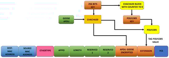 As mentioned above, it is possible to build an AEAD algorithm using ChaCha20 and Poly1305 together, which is why AEAD was given greater emphasis than the use of ChaCha20 and Poly1305 separately, as will be seen below. The algorithm, to perform the Poly1305 MAC TAG, uses the additional text to be authenticated (AAD) and the ciphertext. The AEAD algorithm encrypts the APDU using ChaCha20, and then this text and the additional text are used to calculate the MAC value using Poly1305. To calculate the Poly1305 MAC, a key is generated using a ChaCha20 block with the 32-bit counter block being zero. This MAC value is appended to the “extension” field of the secure GOOSE frame. The length of the “extension” field is reflected in the second byte of the Reserved1 field. The order in which to perform this is detailed in Algorithm 2. Figure 4 shows the process graphically.