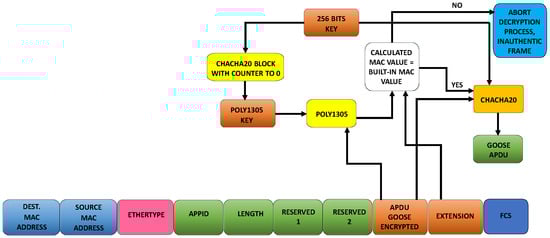 In order to decrypt the APDU, the IED breaker, according to the AEAD ChaCha20/Poly1305 algorithm, must first check the integrity of the Poly1305 MAC TAG, if the calculated value matches the MAC attached in the extension field, the GOOSE frame is authentic, and therefore, is decrypted. The series of steps are as follows (Algorithm 3).