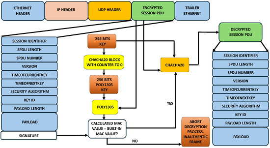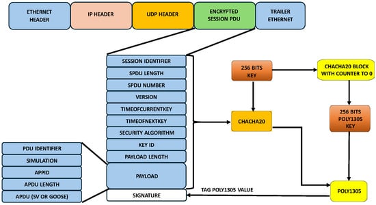 The R-GOOSE frame has different fields than the GOOSE frame, according to IEC61850-90-5, so the following fields have been taken to carry out the AEAD ChaCha20/Poly1305 algorithm (Figure 6). Figure 7 shows the authenticity and integrity verification process of the R GOOSE frame using Poly1305, and if the frame is authentic, the session PDU field of the R-GOOSE frame is decrypted using ChaCha20.