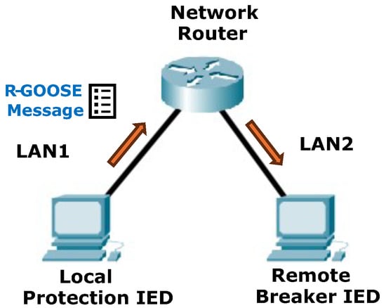 In the case of sending R-GOOSE frames, because these must be sent between IEDs that are on different networks, the LAN switch was changed to a router, maintaining the laptops and the structured cabling from the previous scenario. This can be seen in Figure 9.